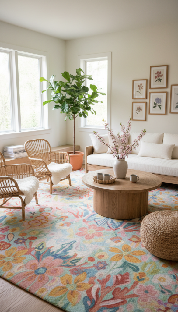 This rug adds a playful touch to the space, making it feel bright and inviting. It pairs beautifully with the soft, neutral tones of the couch and pillows, creating a cozy atmosphere. The pops of color draw the eye and can inspire you to incorporate more spring hues throughout your decor.