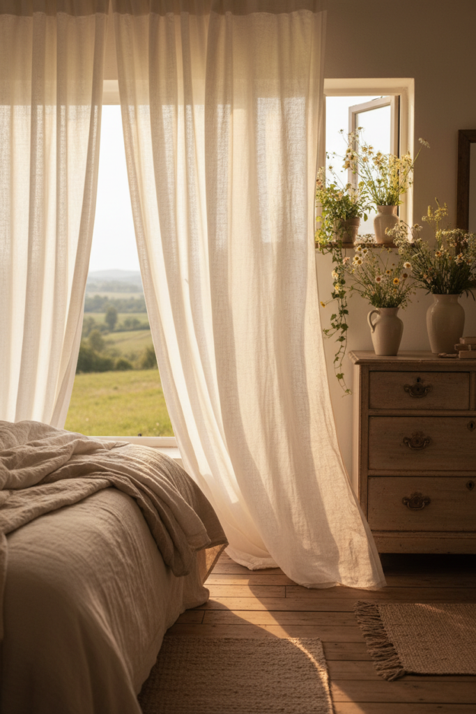Choose warm white or pale oatmeal tones. Let them hang slightly longer so they brush the floor. The soft folds create movement and texture.