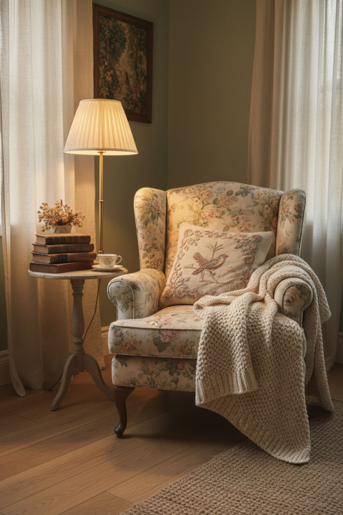 Place a floor lamp beside it with a fabric shade. This small seating area creates a layered, lived-in feeling.