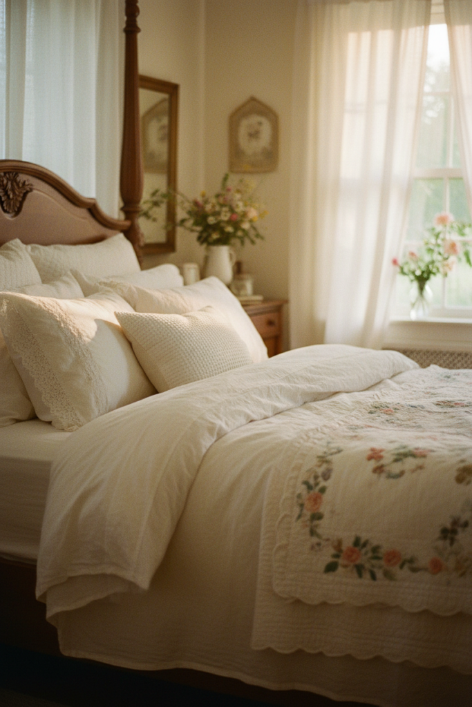 It is not about perfection. It is about layered bedding, warm wood, gentle light, and small details that feel collected over time. The mood is calm and welcoming, like a slow morning with sunlight filtering through linen curtains.