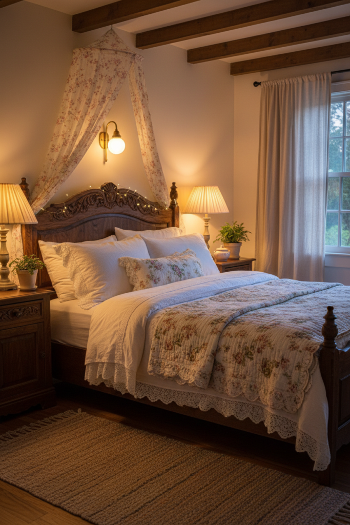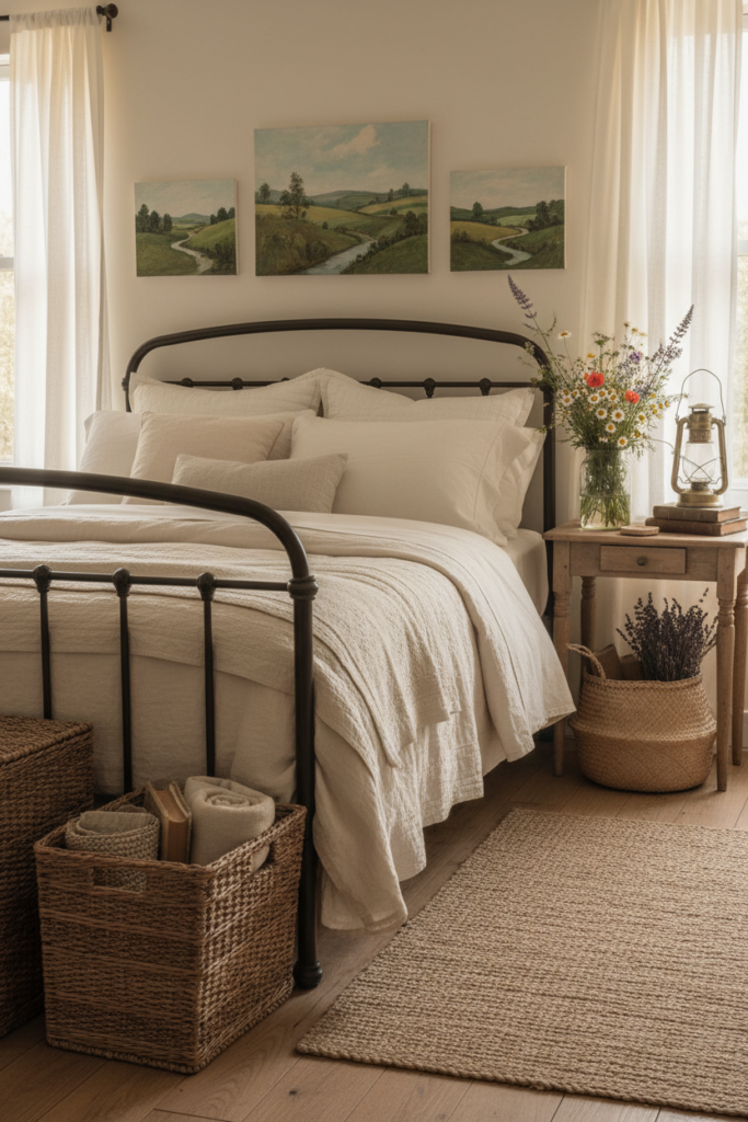 A cottage-inspired bedroom feels soft, relaxed, and quietly charming.