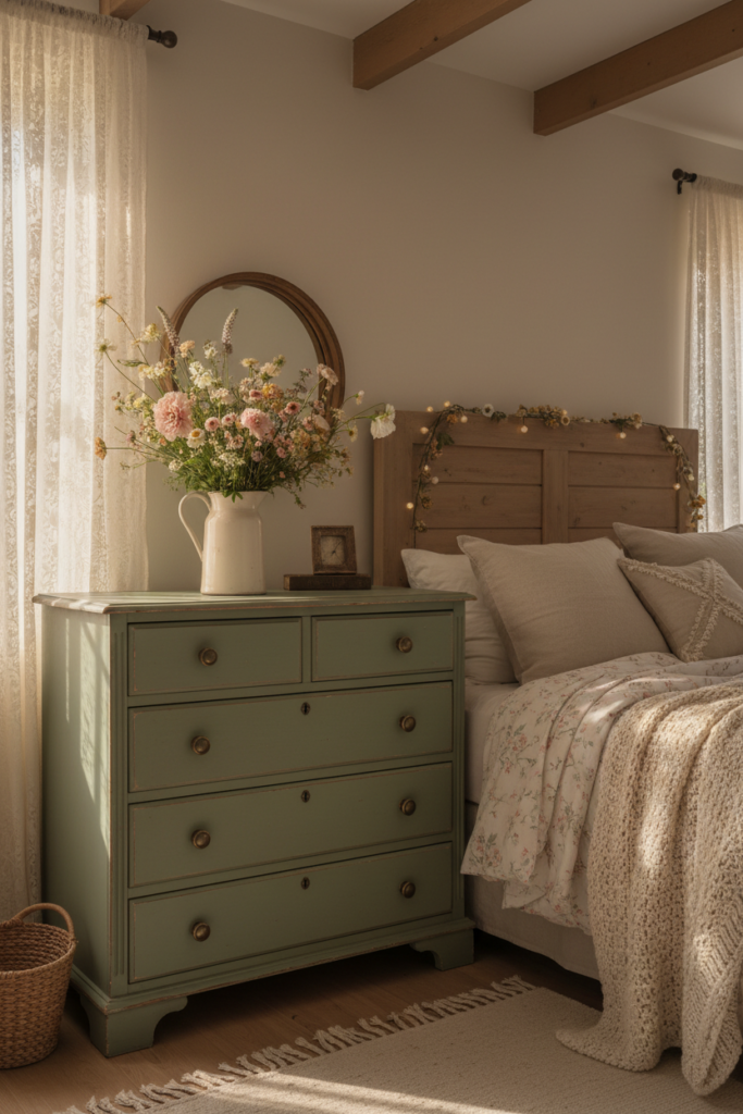 Soft sage, pale blue, or warm white dressers add subtle color while keeping the room calm. Look for matte or slightly distressed finishes for character.