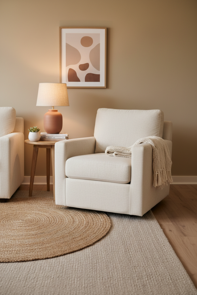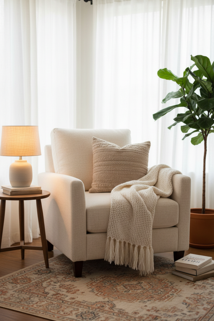 Layer a knit throw over the chair and add one lumbar pillow in a warm neutral shade. A small 4×6 rug underneath anchors the space and makes it feel intentional.