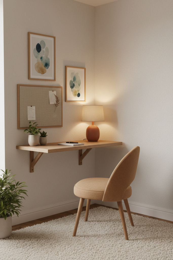 Add a soft rug underfoot and a fabric pinboard or framed art above. Keep the color palette calm so the corner feels focused and peaceful.