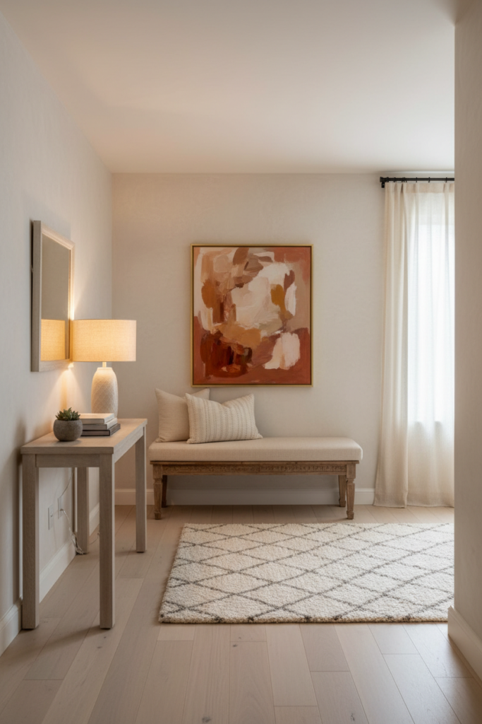 Add a narrow bench against the wall with a soft cushion. Hang one piece of warm-toned artwork above it.