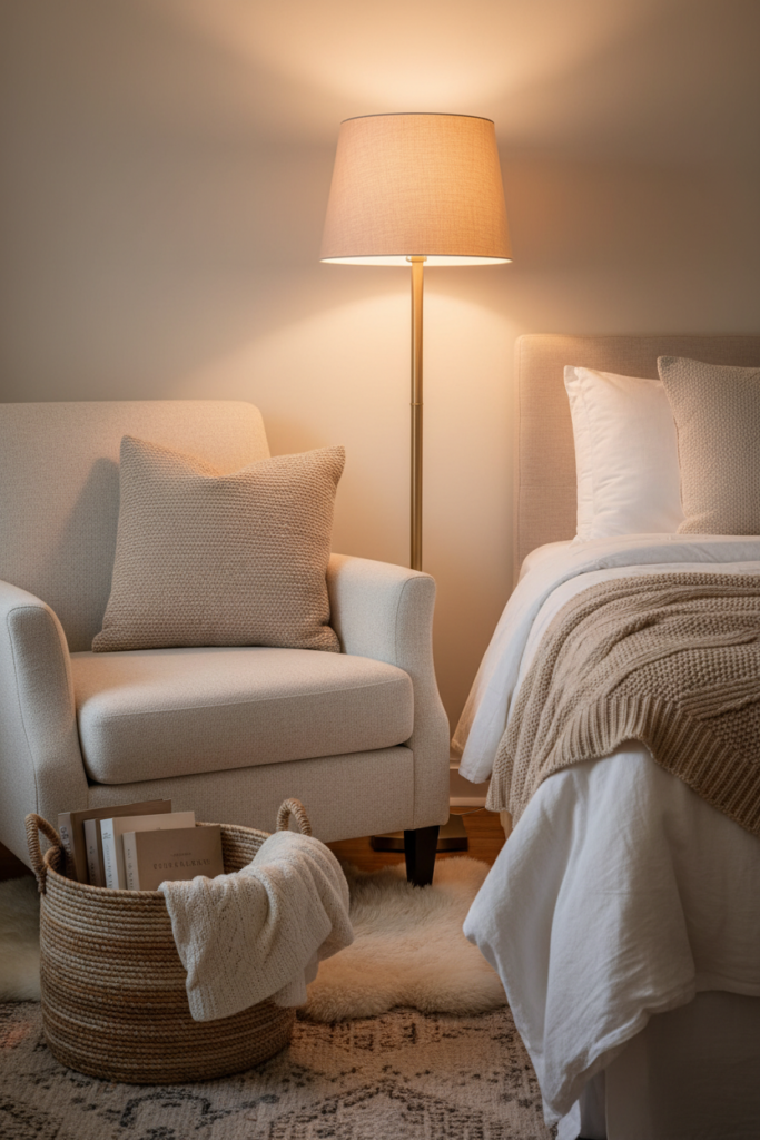 Add a small round side table and a warm-toned table lamp. Use a 2700K bulb for a soft glow that feels gentle at night.