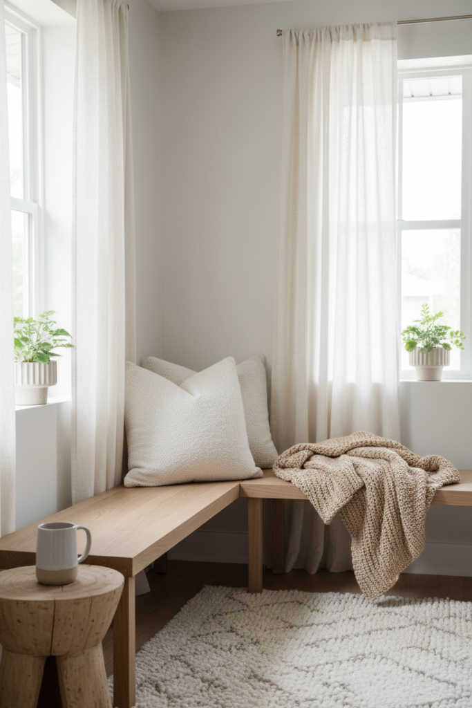 Use linen curtains that soften daylight. A textured cushion and a folded blanket invite you to sit and stay a while.
