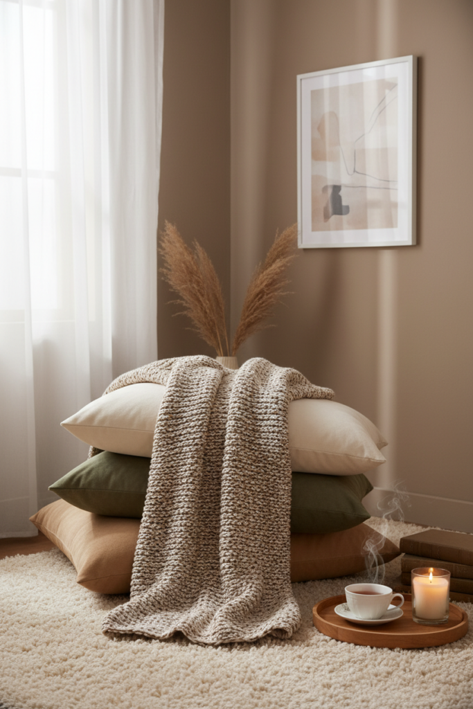 Place two or three oversized floor cushions in a corner of the living room or bedroom. Add a textured throw and a small tray for a candle or tea.