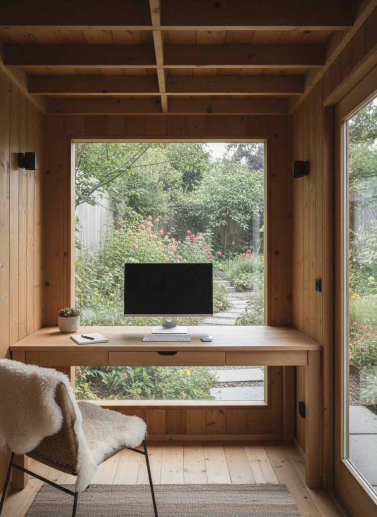 A backyard shed home office offers separation from the main house while maintaining comfort. Large windows, a comfortable chair, and thoughtful décor make the space feel intentional rather than temporary. Surrounded by greenery, working from a garden shed often feels calmer and more inspiring than a traditional indoor office.