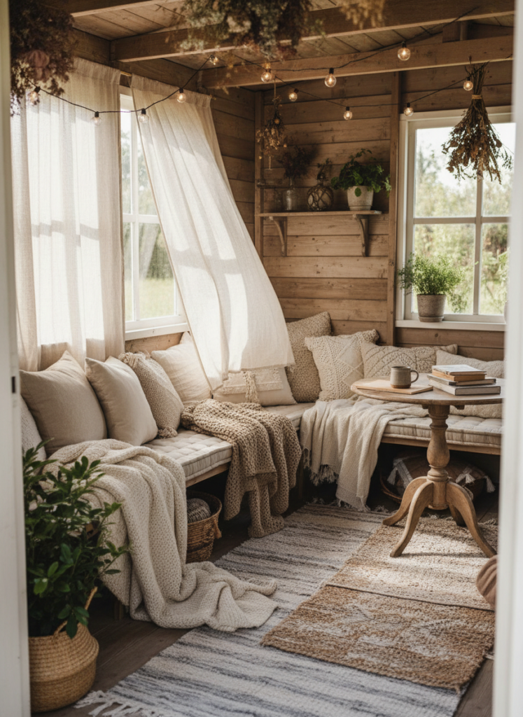 Textiles add warmth in ways that furniture alone cannot. Rugs, curtains, cushions, and even fabric wall hangings soften the space and make it feel lived-in. In a garden shed, these elements help blur the line between indoor comfort and outdoor charm.