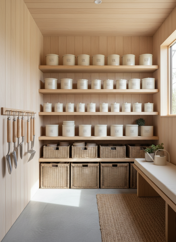 Even storage-focused sheds can feel cozy when designed thoughtfully. Clean lines, matching containers, and intentional organization keep the space visually calm. Adding a small bench, a rug, or simple décor transforms a practical shed into a space that still feels welcoming.
