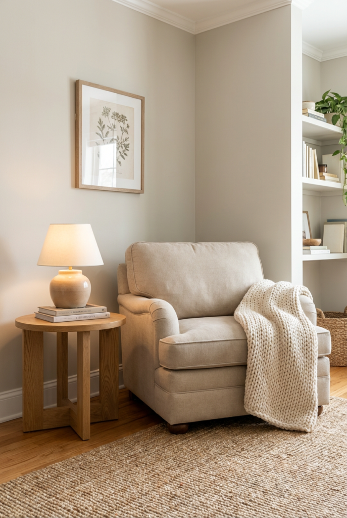 Choose warm whites, soft greige, muted sage, or dusty blue for walls and larger pieces. These shades feel soothing without being dull.