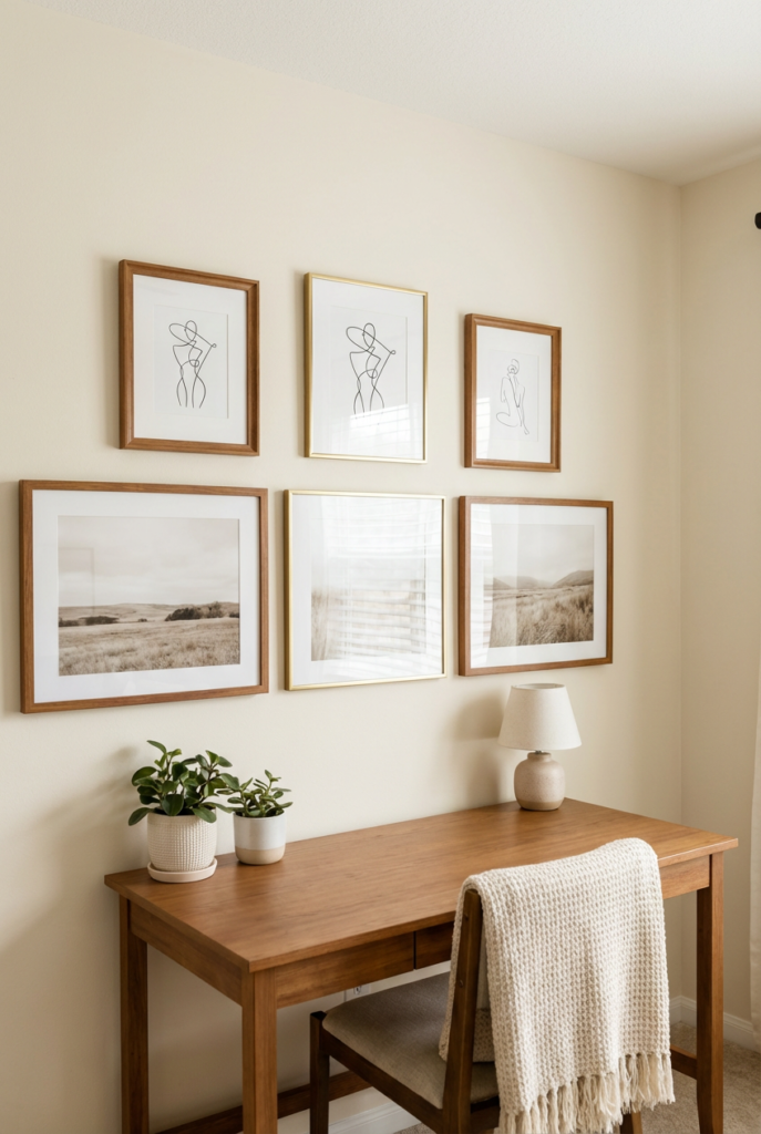 Warm wood or brass frames add subtle richness. Keep the arrangement tidy and balanced for a focused atmosphere.
