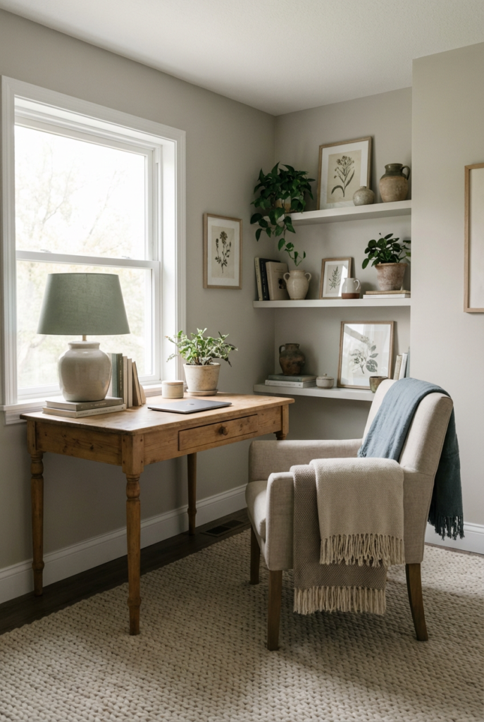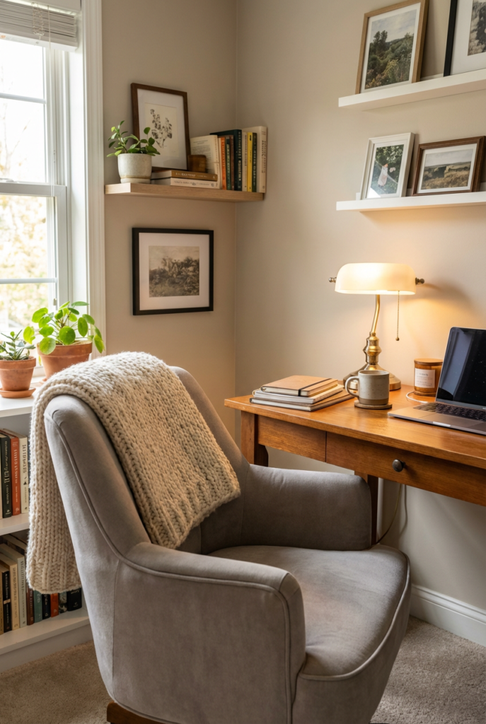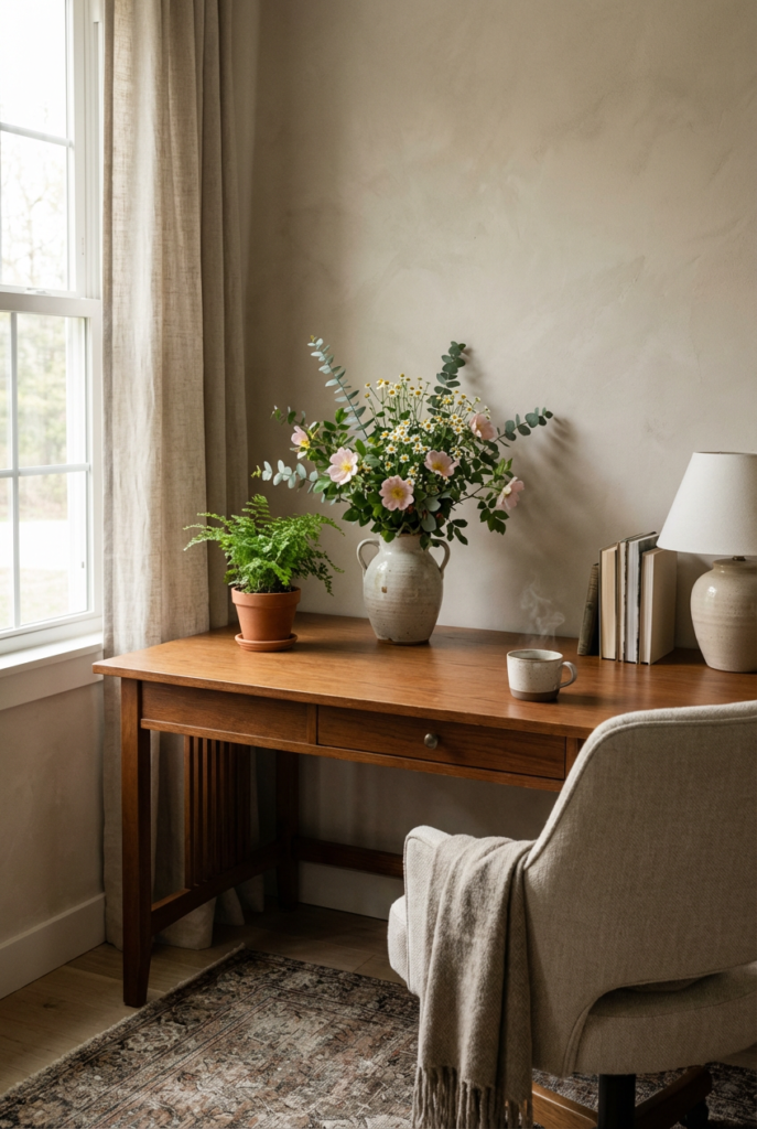 With layered light, soft fabrics, and intentional styling, your home office can become a place where creativity and comfort live side by side.