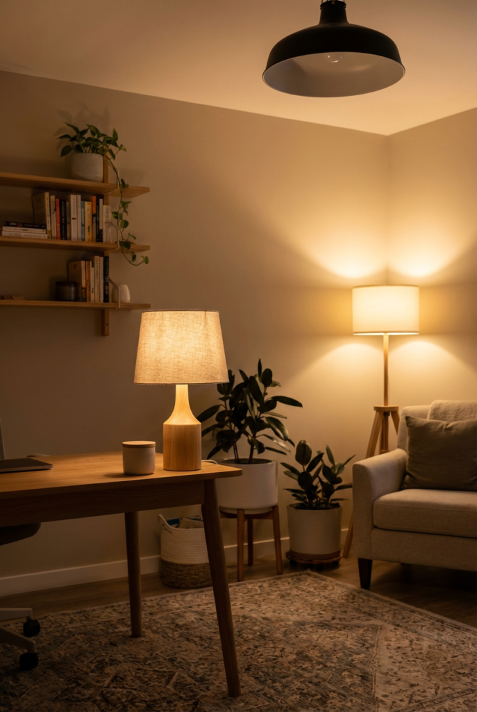 If space allows, include a floor lamp in a corner. Multiple light sources at different heights create depth and comfort.