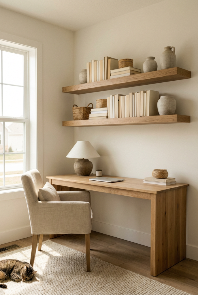 Install one or two floating shelves above the desk. Use them for books, woven baskets, and a few ceramic pieces.