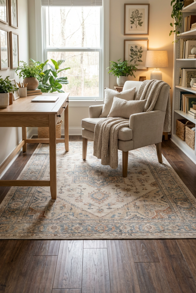 Choose a low-pile wool or vintage-style rug in warm neutrals, muted blues, or soft rust tones. It should extend beyond your desk chair so it rolls smoothly.