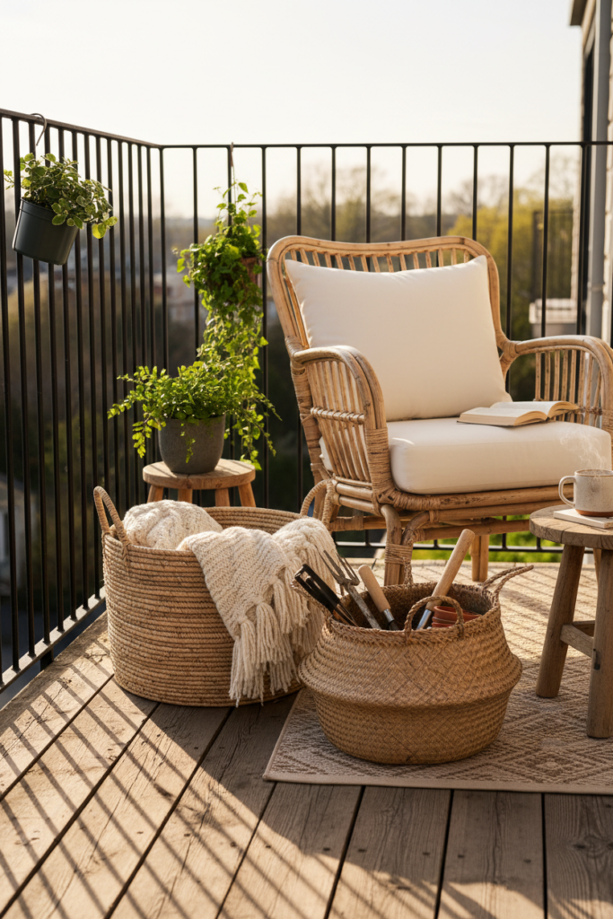 Place woven baskets beside seating to hold blankets or gardening tools. Choose light rattan or seagrass to complement greenery.