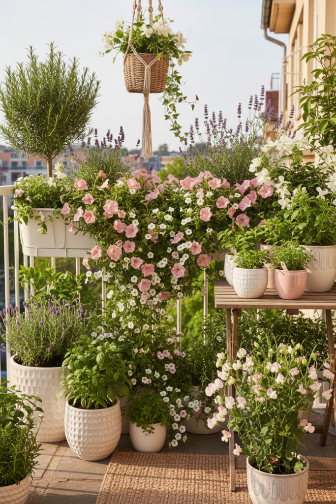 Use a mix of floor planters, railing planters, and small pots on a table. Choose herbs, trailing vines, or compact flowering plants in white, blush, or lavender.