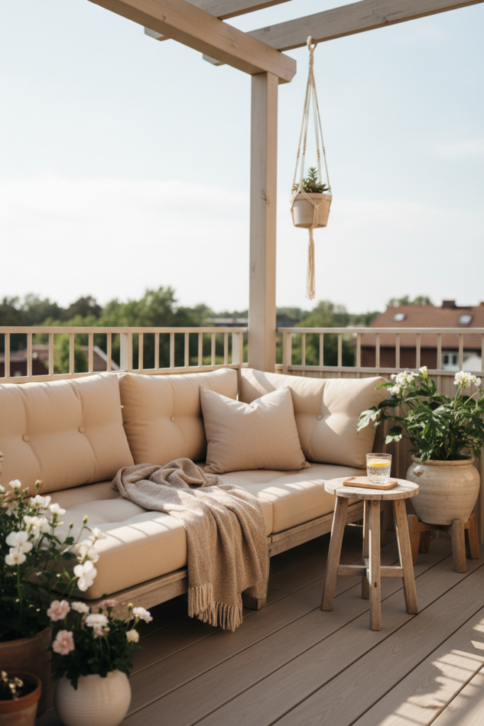 Use a low outdoor sofa or a pallet-style bench with thick cushions in neutral tones. Add a small side table for drinks and a potted plant nearby.