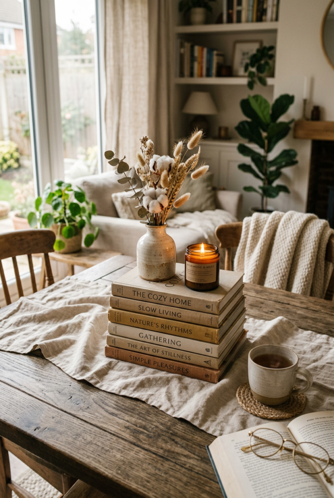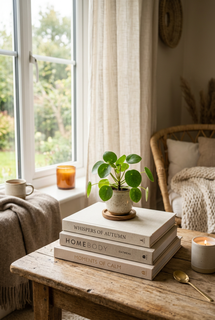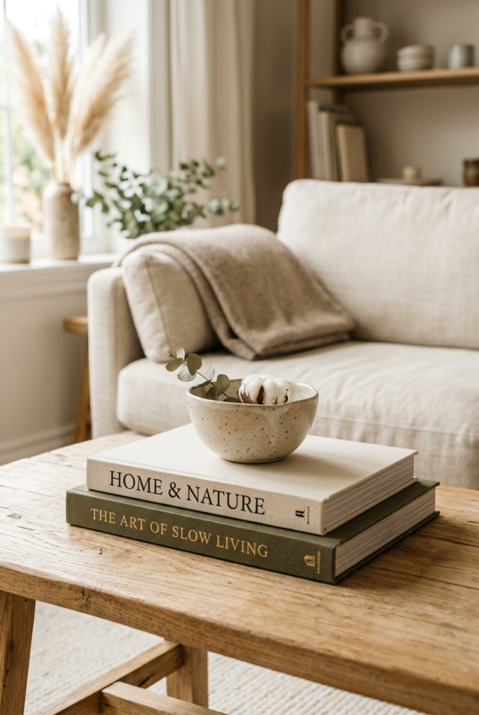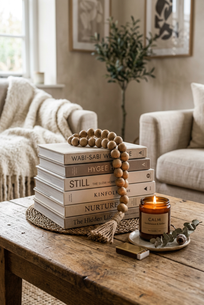 A stack of books paired with a candle, a small plant, or a ceramic object can transform an ordinary surface into something inviting.