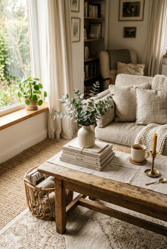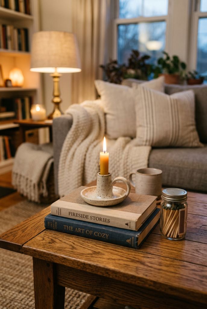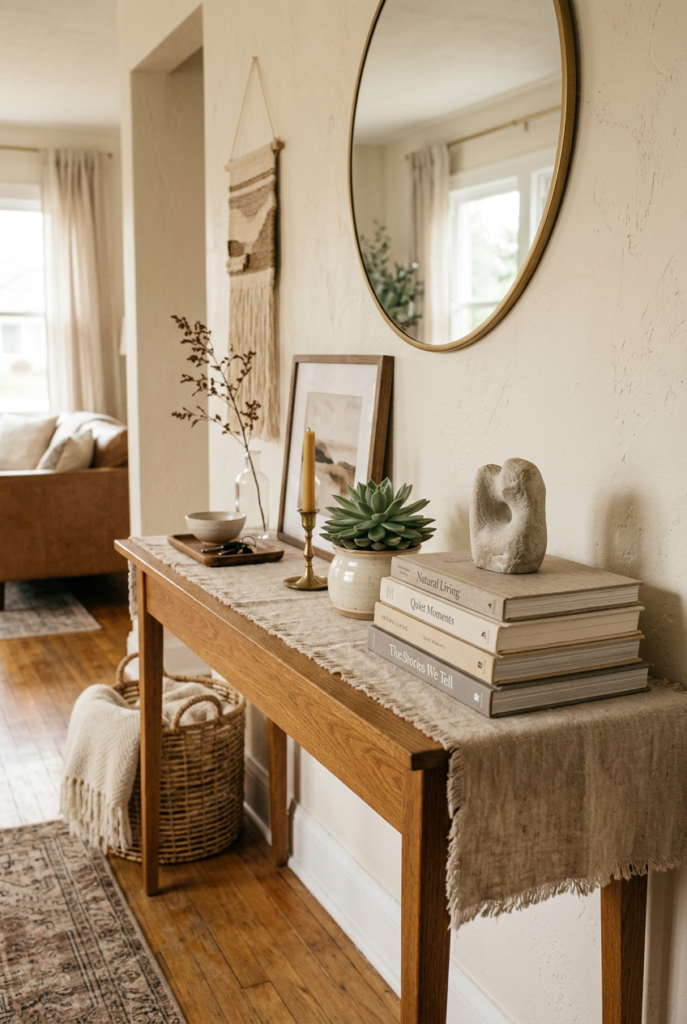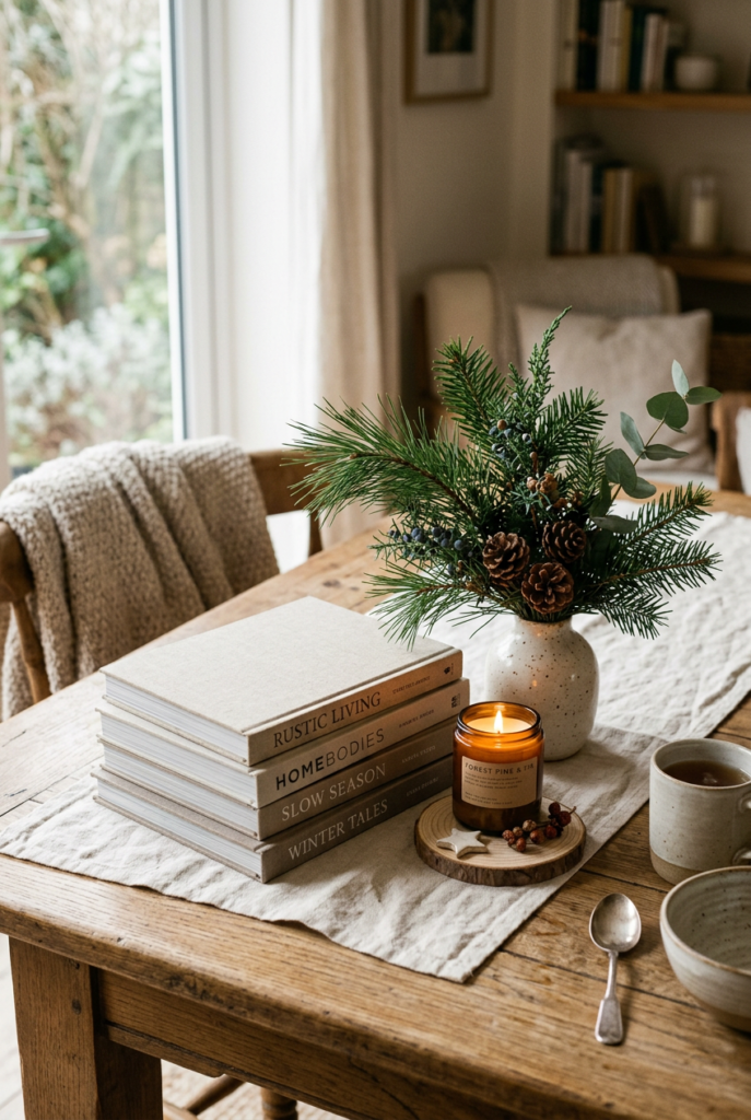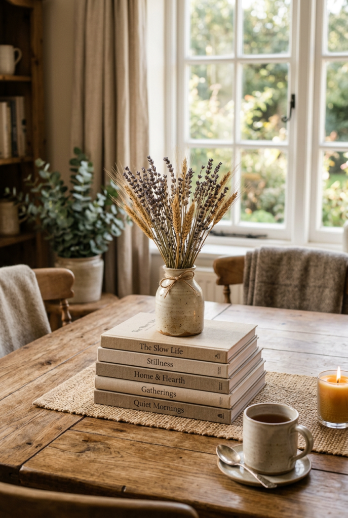 A stack of books paired with a candle, a small plant, or a ceramic object can transform an ordinary surface into something inviting.