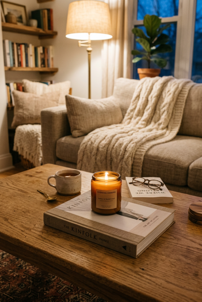For a cozy living room arrangement, pair books with candle accessories.