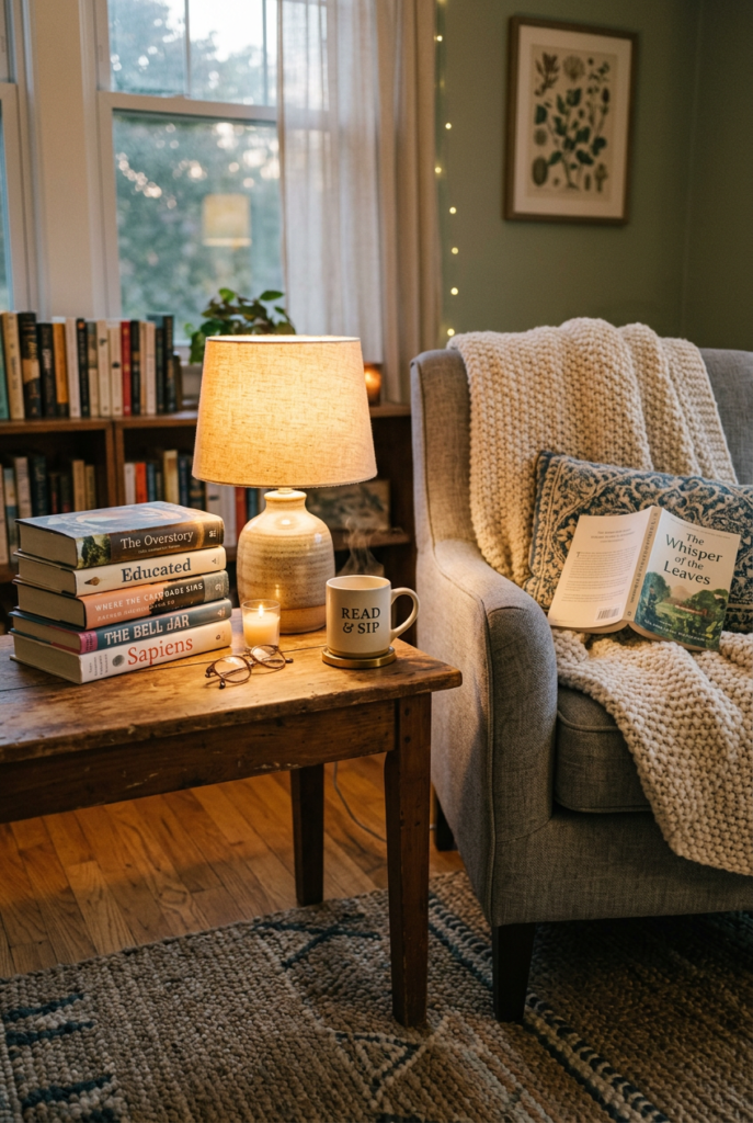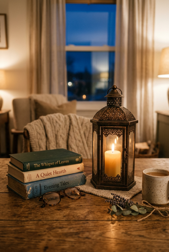 Warm lamps or candlelight make book centerpieces feel especially cozy in the evening.