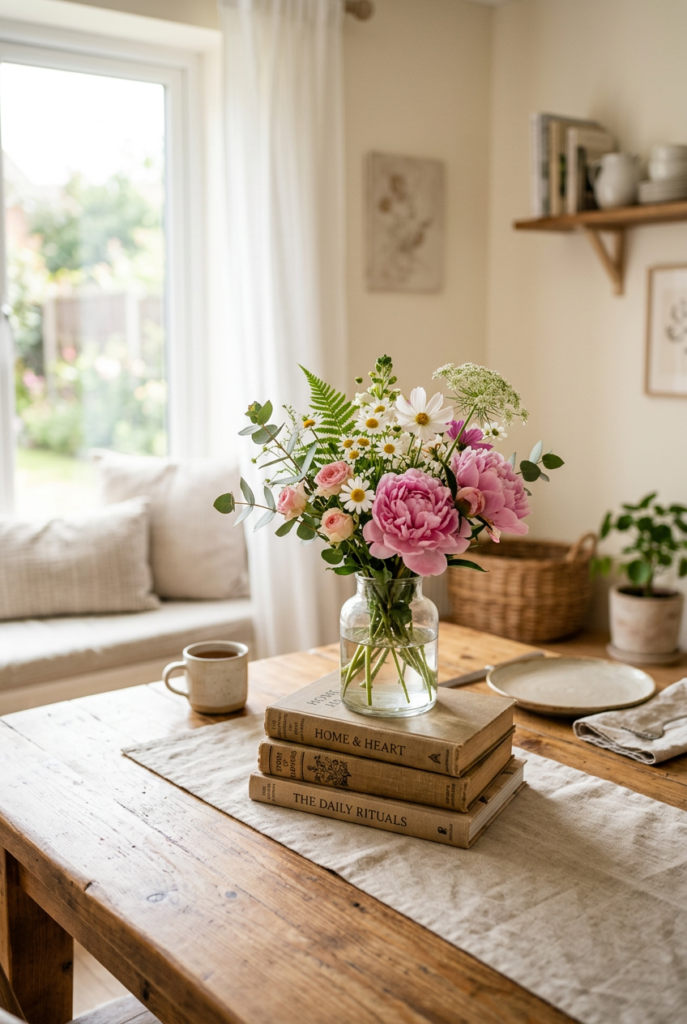 In spring, pair a stack of books with fresh flowers in soft colors. In autumn, add dried grasses or warm-toned candles.
