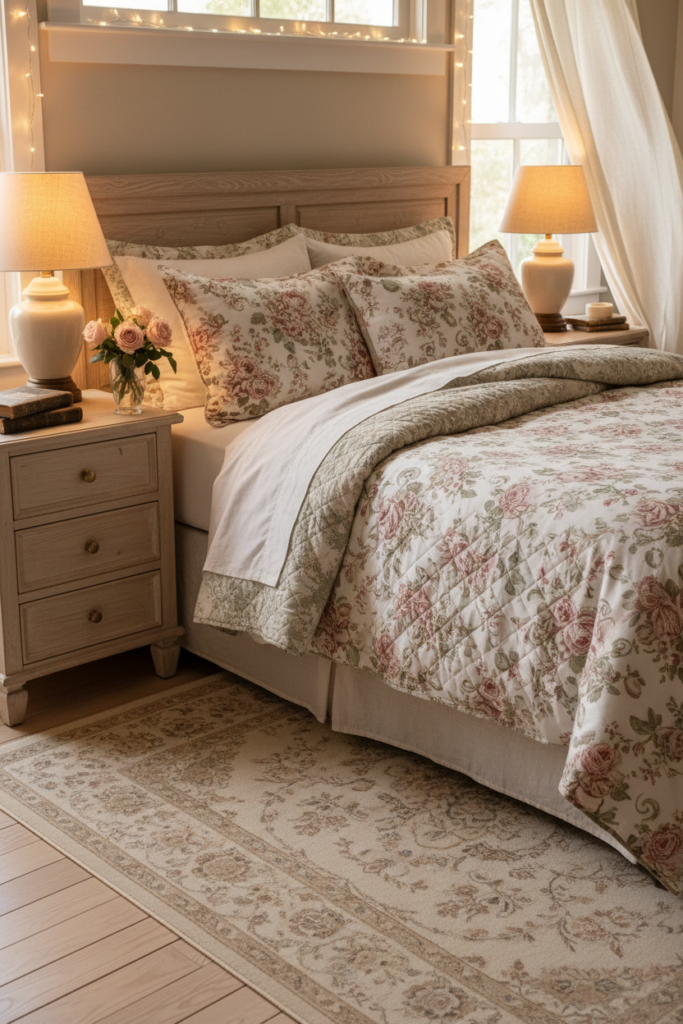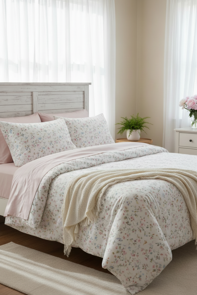 Pair it with solid pastel pillowcases or a lightweight knit throw at the foot of the bed. The result is gentle and romantic without overwhelming the room.
