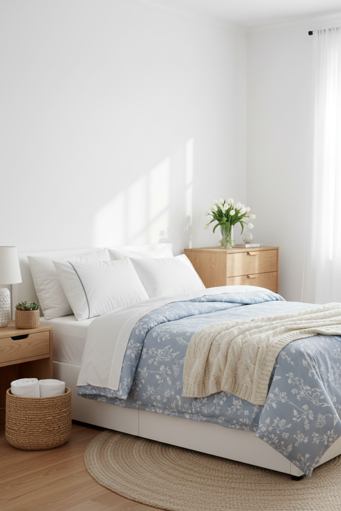 Add a lightweight throw blanket in cream, soft blue, or muted blush at the foot of the bed. This creates a resting point for the eye.