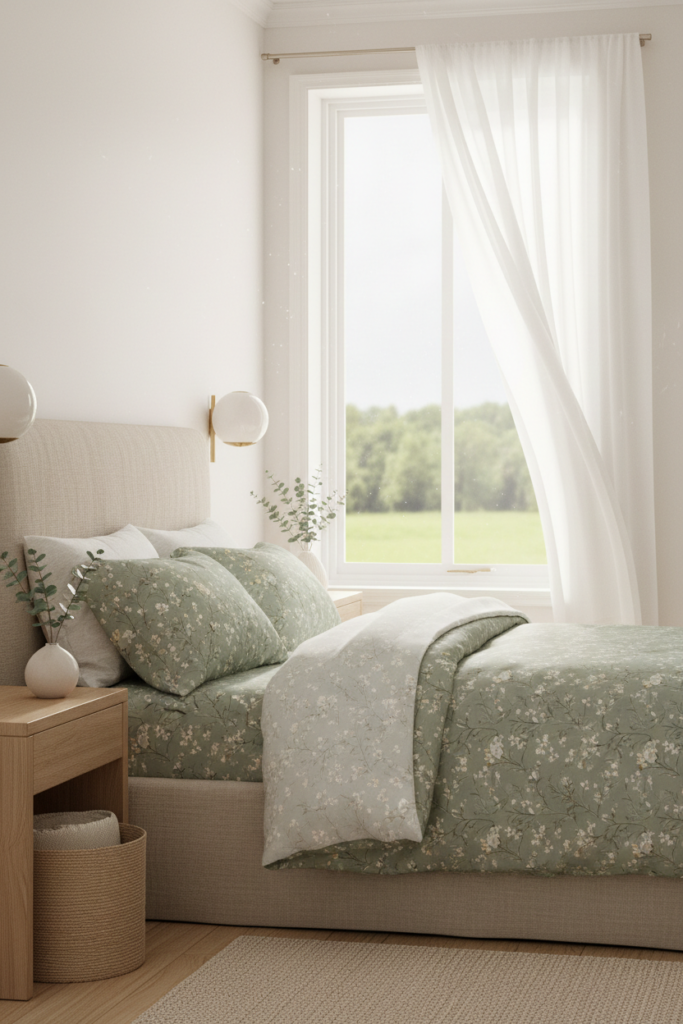 Look for bedding with delicate leaves and small blossoms in muted sage or eucalyptus tones. This color palette feels calming and fresh.