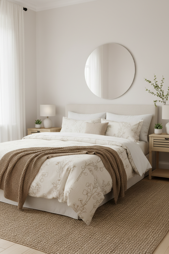 Layer with white sheets and a textured throw in warm taupe. The overall look stays clean but gains subtle charm.