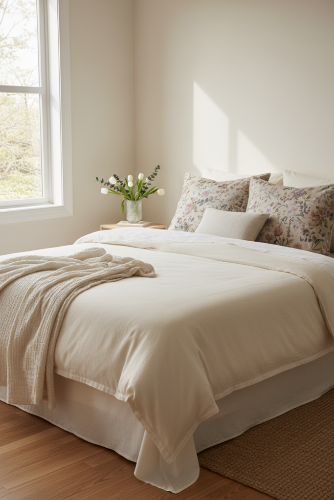 Let the bedding fall naturally rather than tucking everything tightly. The relaxed look enhances the cozy spring atmosphere.