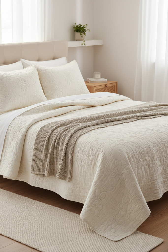 A quilt with stitched floral patterns adds interest through texture instead of color. Choose cream, light taupe, or pale gray for a soft layered look.