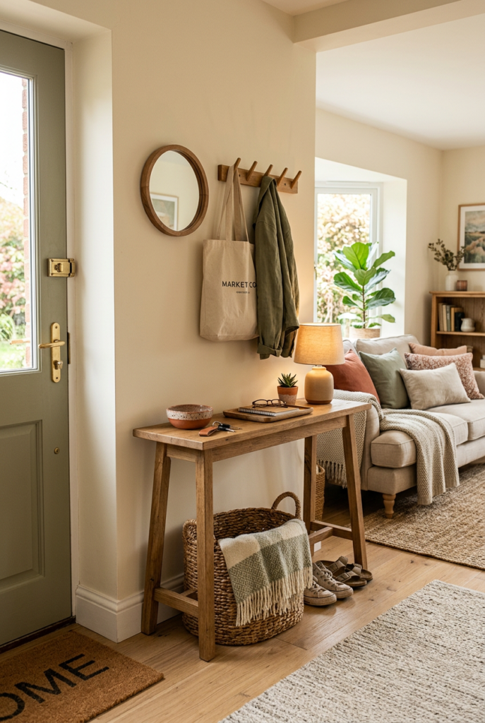 Create a small landing spot with a tray or bowl for keys and a hook for bags.