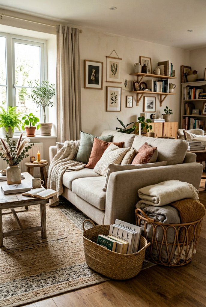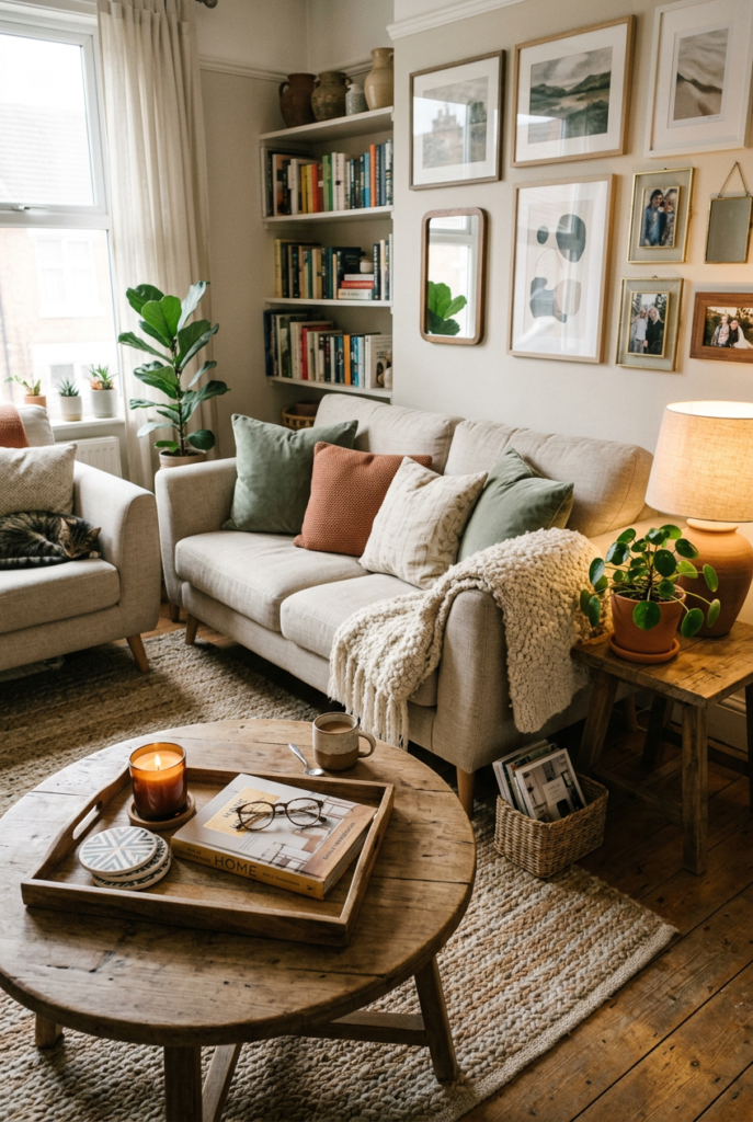 It is where blankets gather after movie nights, books are left open on the coffee table, and small everyday items slowly collect on shelves.