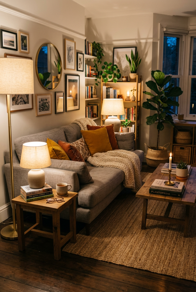 Place a floor lamp near the sofa and a table lamp on a side table instead of relying only on overhead lighting.