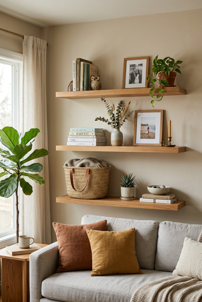 Baskets hold blankets, trays gather small items, and shelves feel balanced instead of crowded.