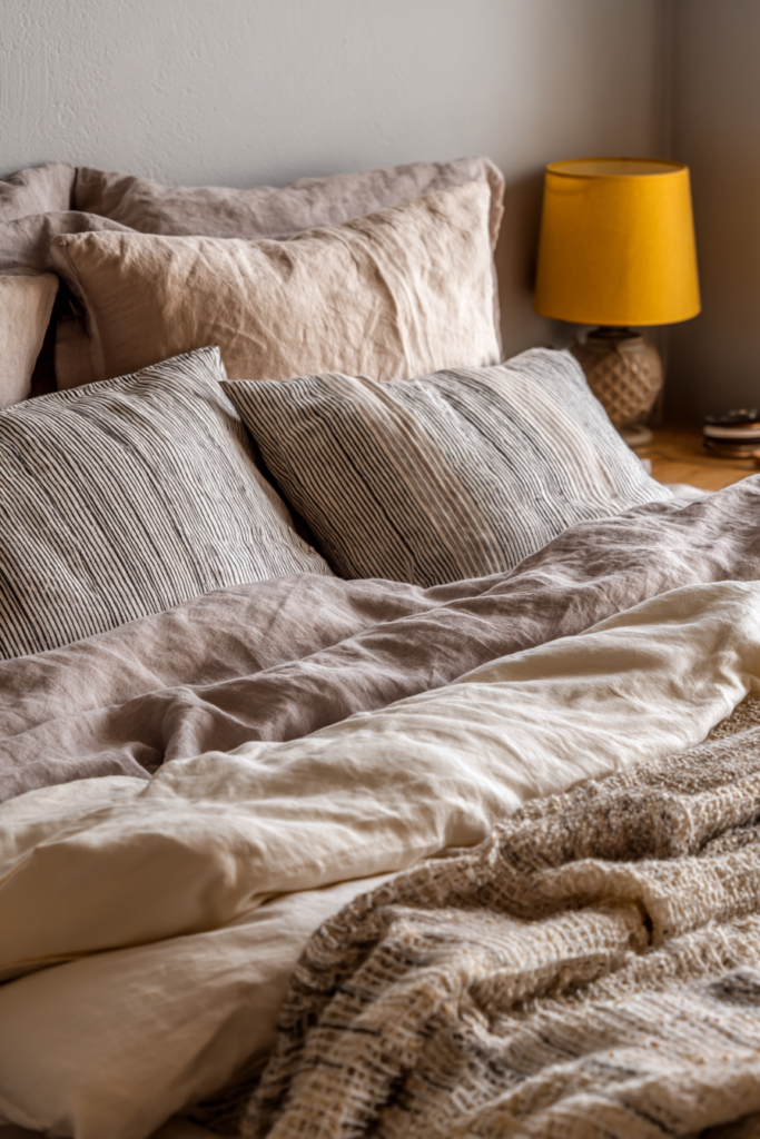 Adding an extra duvet, a quilt, or a lightweight comforter creates insulation while still allowing flexibility. A folded throw or knitted blanket at the foot of the bed adds both warmth and visual softness, making the bed look more inviting without feeling cluttered.
