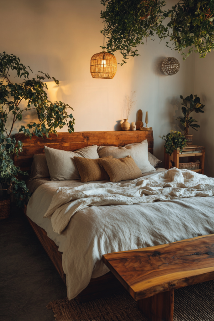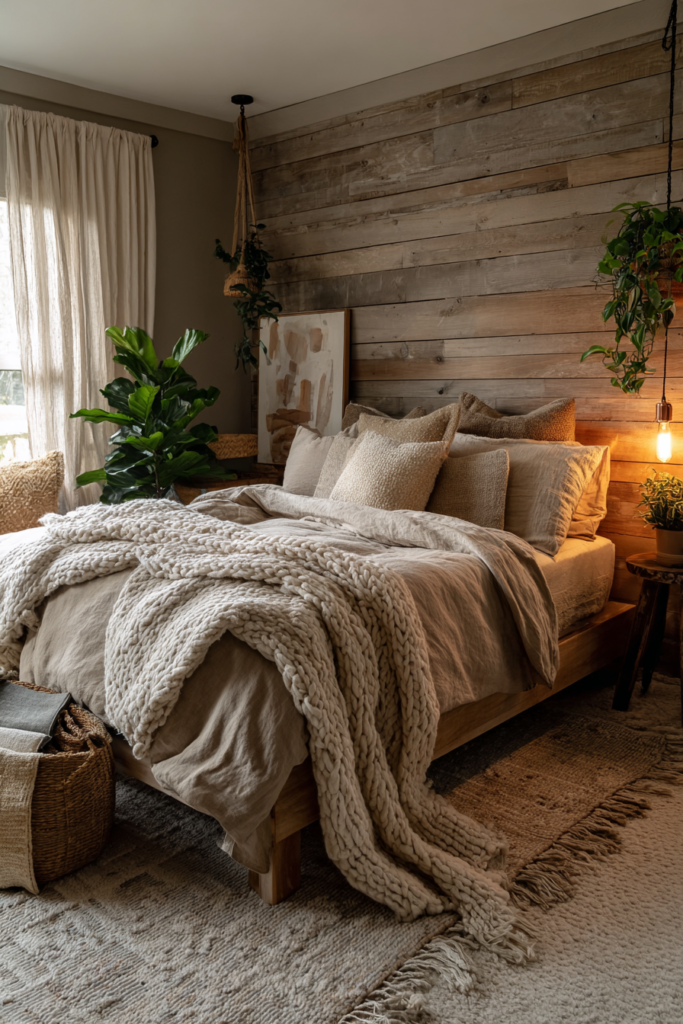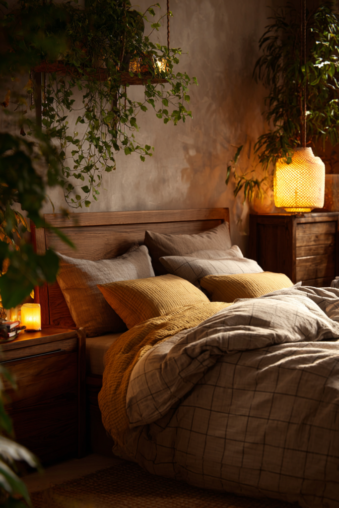 These elements create contrast with soft textiles and layered bedding, making the room feel thoughtful and complete. The result is a cozy space that still feels fresh and connected to nature.