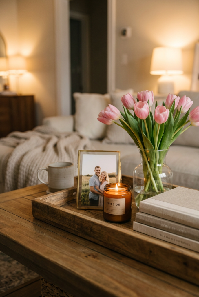 You can also adjust styling with the seasons. In fall, add a small bowl of pinecones or a warm-toned candle. In spring, use fresh tulips in a simple glass vase.
