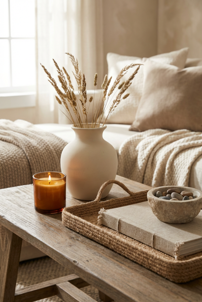 Once your base is in place, add objects of different heights. A small vase with fresh greenery, a candle in a glass holder, or a sculptural object can create gentle variation.