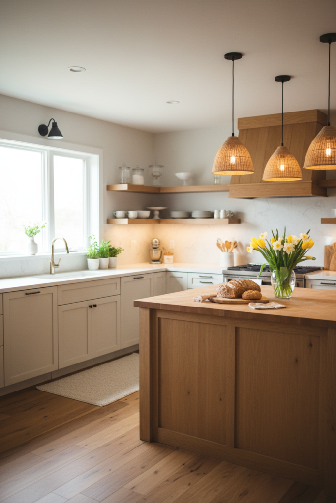 Spring interiors often benefit from slightly brighter light in task areas.