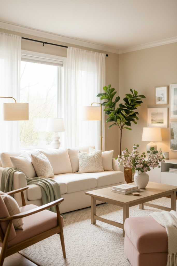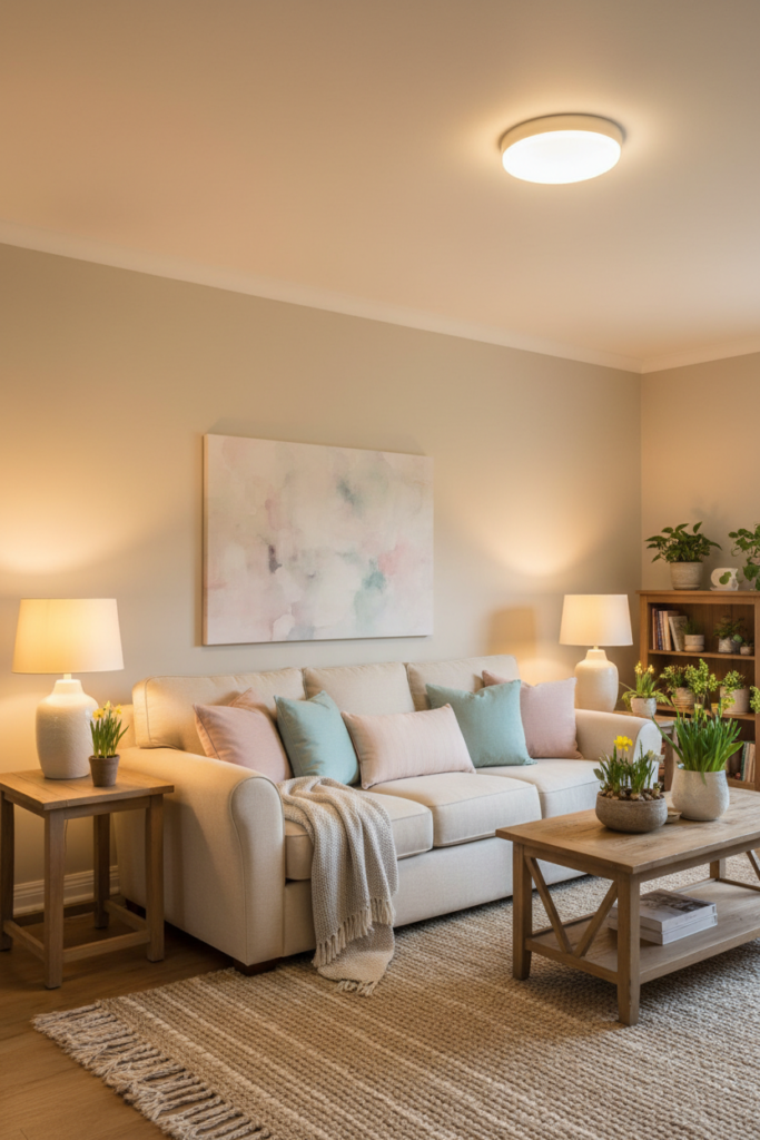 Soft sage, blush, and cream tones look richer under 2700K light.