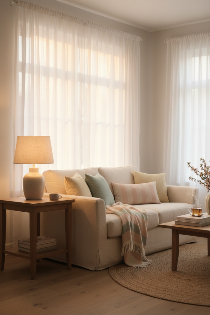 Warm light reflecting off linen curtains and textured decor creates a soft glow that enhances spring colors.