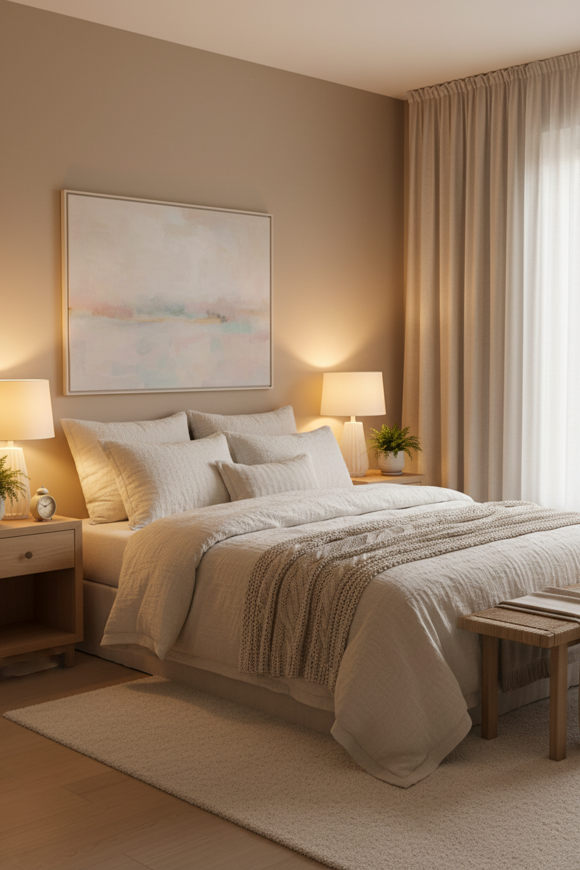 Soft sage, blush, and cream tones look richer under 2700K light.