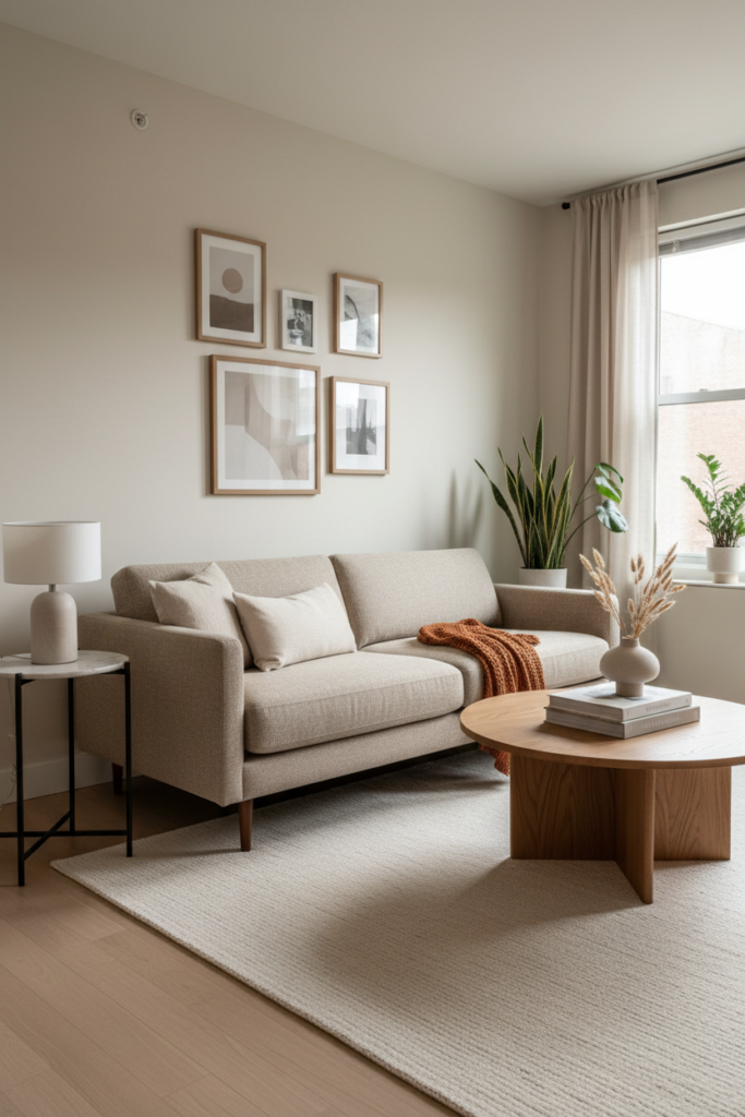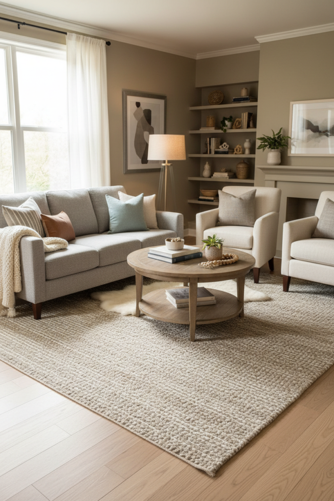 Add one soft layer within reach of every seat. A small side table, a lamp, or a textured throw makes the layout feel complete.