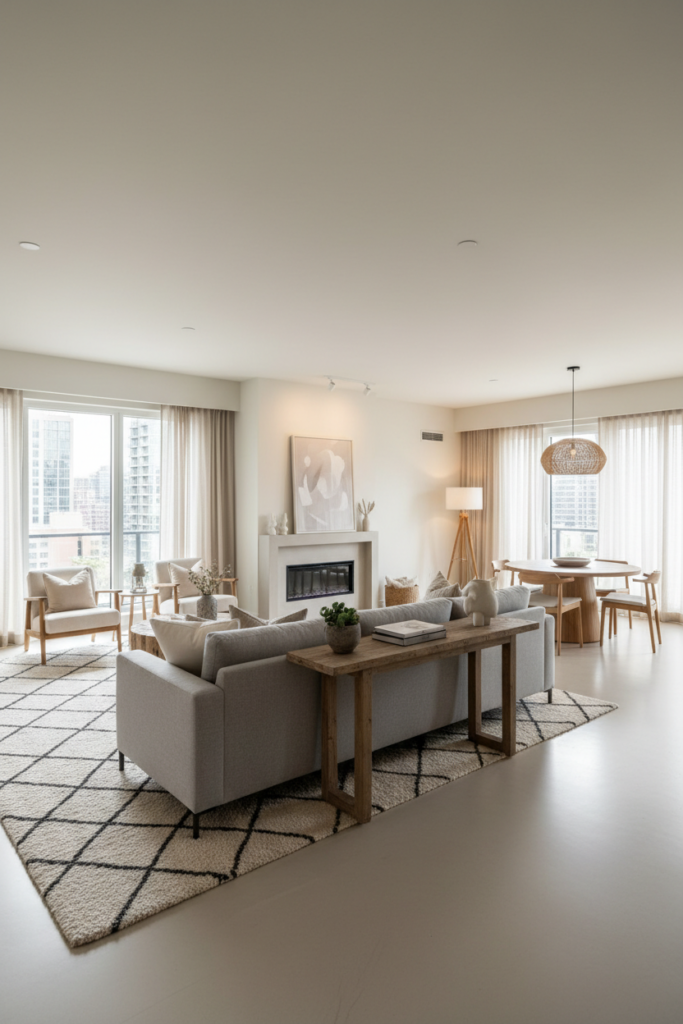 A well-planned apartment living room layout follows a few key principles: