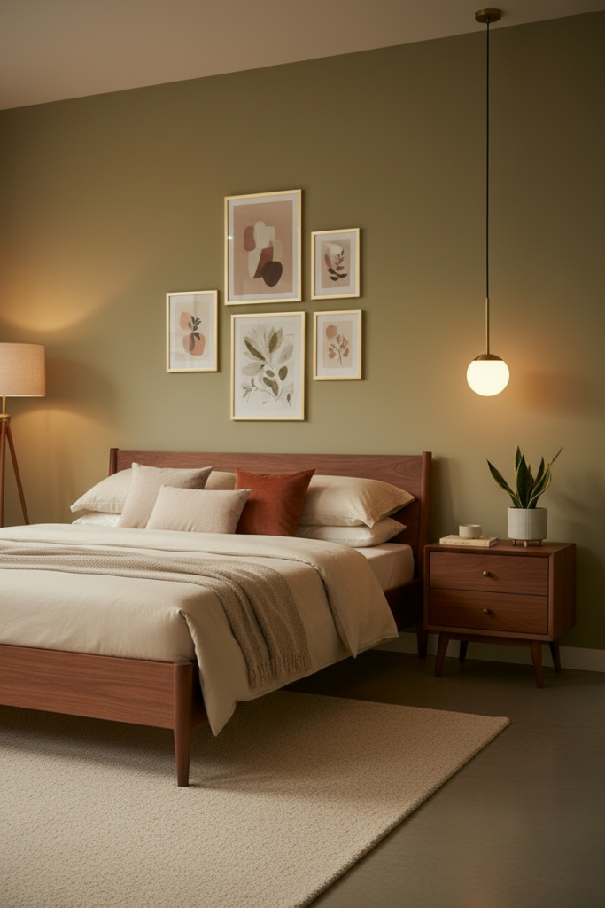 Warm light enhances walnut, teak, and brass surfaces, which are common in mid century interiors.